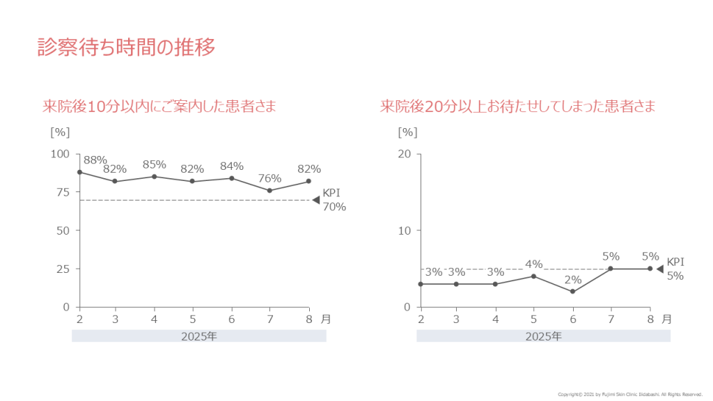 このKPIの達成状況を測定するべく、当院では全ての患者さまの診察待ち時間を計測。実績を公開いたしますので、当院をご受診される際のご参考になさって下さい。